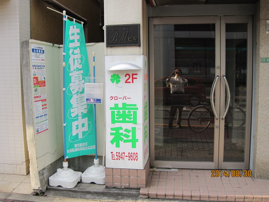 ビルの左端が2階から4階への入り口です。ビルの工事期間には、のぼりとパンフレットスタンドが撤去されていますからご注意ください。